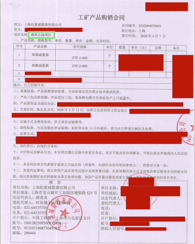 上海松夏减震器有限公司官方网站为您介绍:【福州森林公园项目】使用ZTF型弹簧减震器采购合同信息,我们松夏公司2020年为【福州森林公园项目】使用ZTF型弹簧减震器,起到了减震和降噪的作用,以下是【福州森林公园项目】使用ZTF型弹簧减震器采购合同介绍。